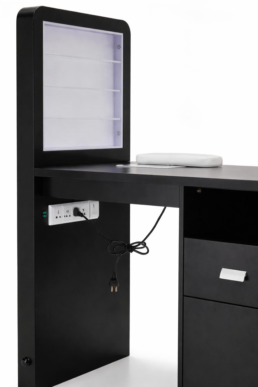 An organised manicure station is essential for efficiency and presentation. The Aura Black Manicure Table includes integrated storage options that allow nail tools, products, and accessories to be stored neatly and kept within easy reach. This reduces surface clutter, saves time during treatments, and helps maintain a clean and professional salon environment.